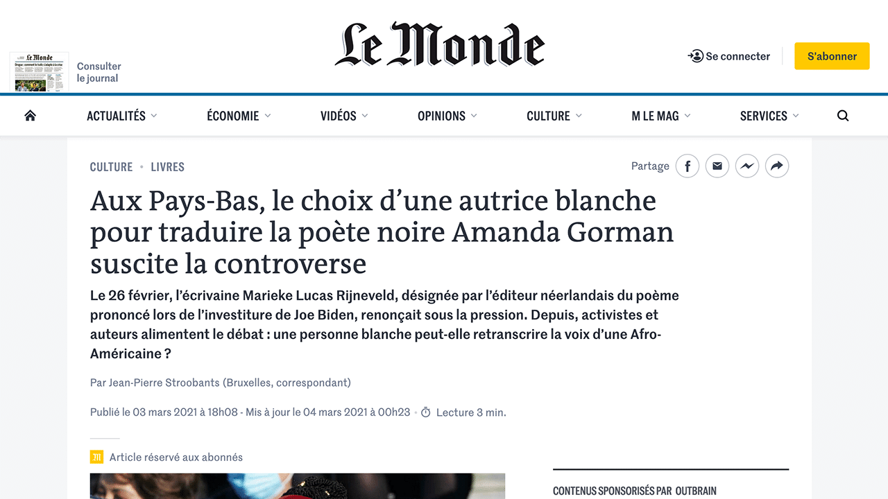 Le 26 février 2021, l’écrivain Marieke Lucas Rijneveld, choisie par l’éditeur néerlandais du poème d’Amanda Gorman, sous la pression renonçait à le traduire. Depuis, militants, intellectuels bien vus et milieux culturels débattent, à condition que cela reste circonscrit dans des salons de gauche.