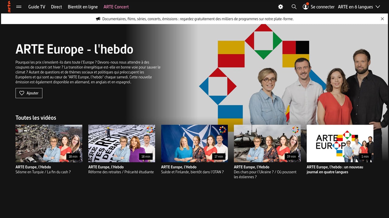 Tant aimée par les enseignants du secondaire sympathisants socialistes et autres cultureux d’un niveau parfois discutable, cette chaîne est un média de service public détenu par Arte France, dont le Conseil de surveillance est présidé par Bernard-Henri Lévy, et la société allemande Arte Deutschland TV. Tout juste trentenaire, Arte lance une émission d’actualité hebdomadaire proposée dans d’autres langues que le français et l’allemand, une initiative saluée notamment par Le Monde et impliquant des médias partenaires aux affiliations politiques avérées.