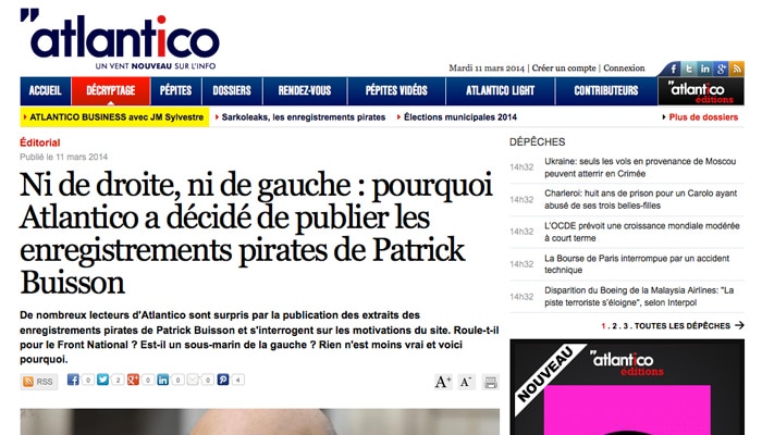 Après avoir publié, le 5 mars dernier, certains enregistrements de Patrick Buisson lors de ses réunions avec Nicolas Sarkozy, le site d’information Atlantico a fait part de son intention de porter plainte contre Valeurs Actuelles et Slate.fr.