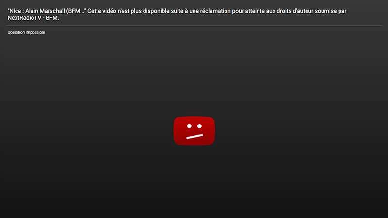 Cette vidéo, reproduite sur le compte d’un utilisateur de la plateforme YouTube n’est plus disponible suite à une récente réclamation pour « atteinte aux droits d’auteur » soumise par NextRadioTV — BFM. Des centaines d’autres vidéos de BFM sont pourtant toujours en ligne sur YouTube sans qu’aucune forme de réclamation ne soit intervenue en plusieurs mois. De là à parler de réclamation sélective…