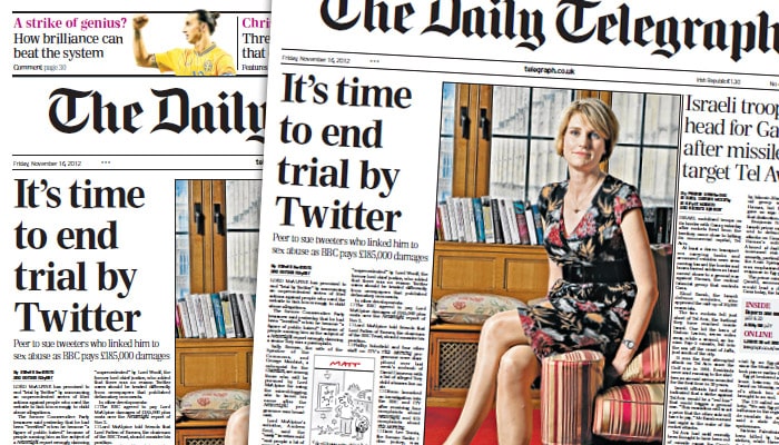 Lord McAlpine, lui, annonce par l’intermédiaire de son avocat qu’il sait qui sont les personnalités coupables d’avoir livré son nom en pâture sur Twitter, qu’il attend leurs excuses publiques, et aussi des réparations de la BBC (tout en précisant qu’il va être modéré dans ses demandes parce qu’il est bien conscient qu’au final, c’est le contribuable qui va payer via la redevance). Un accord à l’amiable est trouvé avec la BBC, qui accepte de verser au Lord calomnié 185,000 livres. Puis, surenchère le 16 novembre : des plaintes en diffamation vont être intentées contre une douzaine de personnalités, principalement des journalistes, pour leurs tweets, même effacés ultérieurement, et même si ce sont de simples retweets. Le Daily Telegraph titrait vendredi 16 novembre, « It’s time to end trial by Twitter ». Pour Lord McAlpine et pour ceux qui le soutiennent, il faut en finir avec l’impunité sur Twitter et les poursuites dans cette affaire doivent servir d’avertissement.