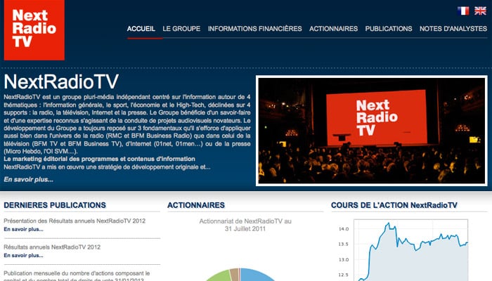 « En 2013, RMC Découverte devrait réaliser un chiffre d’affaires de 7 millions d’euros et limiter sa perte à une dizaine de millions », a‑t-il poursuivi. Dans le numérique aussi, NextRadioTV entend s’imposer. Avec les sites 01net.com et bfmtv.fr, le groupe compte 10 millions de visiteurs uniques. Il vise 50 % d’augmentation en s’appuyant notamment sur le côté viral des vidéos diffusées par BFMTV.