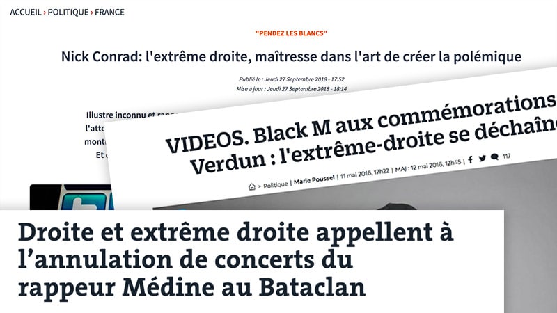 Mais pour certains médias, là n’est pas le problème. Ainsi, pour France Soir, au sujet de la chanson de Nick Conrad, « l’extrême droite (est) maîtresse dans l’art de créer la polémique ». France Info donne la parole au Président de SOS Racisme « C’est l’extrême droite qui en a fait la promotion ». Pour Agoravox, le rappeur est « l’idiot utile de l’extrême-droite ».
