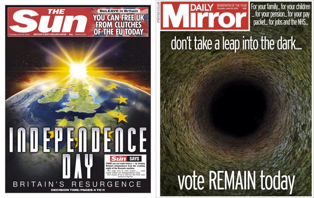 Au Royaume-Uni, pour le référendum du jeudi 23 juin, la presse était à l’image du pays : divisée. Le Sun, le Daily Express et le Sunday Times se sont ainsi positionnés pour une sortie de l’UE, tandis que le Guardian, le Daily Mirror et les quotidiens économiques (The Economist, The Financial Times) ont milité en faveur du « Remain ».