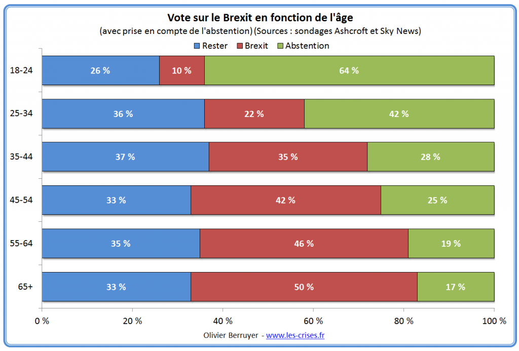 Certes les 18–24 ont voté à 73 % pour le « Remain », mais un autre graphique nous indique que l’abstention chez les jeunes a été colossale. En effet, 64 % d’entre eux n’ont pas été aux urnes, ce qui signifie concrètement que seuls 26 % des « jeunes » ont en réalité plébiscité le vote « In ». De quoi remettre les choses en perspective.