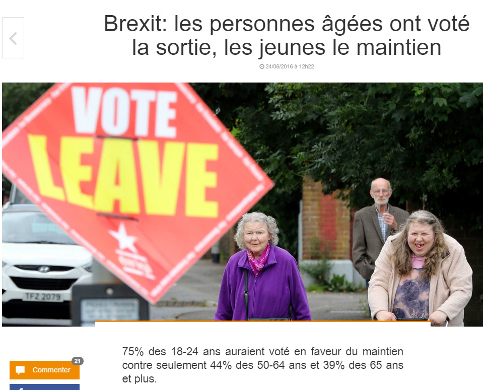 Pour Vanessa Schnelder, également journaliste au Monde, ce n’est pas un Brexit mais un « Beurkxit ». Pour l’AFP, la jeunesse est « amère » et « furieuse » envers les plus âgés. Pour Le Monde, les vieux ont « confisqué » leur futur à des jeunes pleins d’« amertume ». Du côté de BFMTV, tout est une question d’image d’illustration…