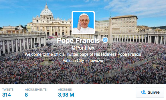 En ce qui concerne les réseaux sociaux, là encore, le Pape frappe fort. Son compte Twitter @pontifex en neuf langues a dépassé à l’heure actuelle les 5 millions de « followers »… À ce propos, le Père Federico Lombardi, porte-parole du Vatican, a notamment déclaré : « Avec son style de vie très simple, le Pape n’est pas un grand utilisateur de nouvelles technologies et pourtant sa prédication est particulièrement adaptée pour être relancée par tweets ». Une situation qui ne manque pas de soulever certaines interrogations : à un moment où plusieurs intellectuels, journalistes et sociologues se penchent sur les effets négatifs de Twitter sur la culture, celui qui devrait être le porteur du message le plus élevé serait ainsi, lui-même, parfaitement en phase avec la dictature des 140 caractères ?