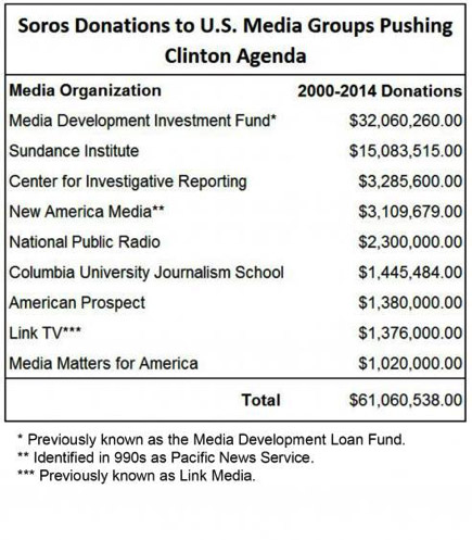 Non content d’avoir appuyé le parti démocrate puis la candidate Hillary Clinton pour au moins 25 millions de dollars au cours des dernières années, George Soros a surtout injecté plus de 100 millions de dollars entre 2000 et 2014 dans des groupes médiatiques proches du parti démocrate, de son agenda et de ses objectifs politiques. Ces sommes sont à mettre en perspective avec la fortune personnelle de Soros estimée à 24 milliards de dollars selon le classement Forbes.