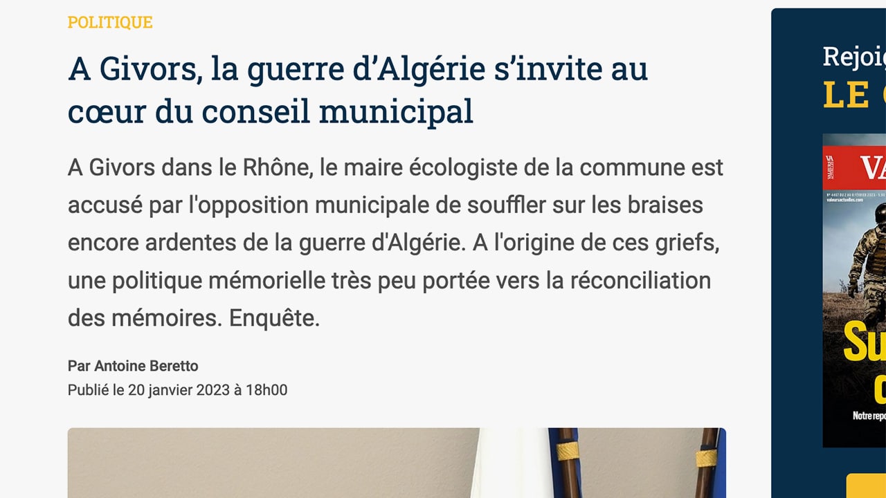 Dans cette commune rhodanienne de 20 000 habitants située à l’extrémité Sud de la métropole de Lyon, le maire multiplie en effet, depuis son élection, des cérémonies mémorielles relatives à la guerre d’Algérie, au contenu particulièrement orienté et dédiées à des évènements sans aucun lien géographique avec sa ville. Ainsi, outre la commémoration de la date du 19 mars, à laquelle le président Hollande avait donné un caractère officiel bien qu’elle soit fortement contestée par les associations de Harkis, Valeurs Actuelles recense également une invitation de Benjamin Stora, « universitaire au passé trotskiste (…) qui avait été convié pour s’exprimer à l’occasion d’une conférence organisée par la ville » avec l’orientation pro-FLN qu’on peut attendre de cet historien engagé, une rue « rebaptisée Gisèle Halimi », célèbre pour avoir été « l’avocate des militants du FLN et pour s’être violemment opposée aux harkis (…), une commémoration de « l’autre 8 mai 1945 » (…) destinée à rendre hommage aux victimes algériennes lors de soulèvements dans plusieurs villes du pays, une stèle en mémoire de la répression d’une manifestation de partisans du FLN le 17 octobre 1961 », ainsi qu’une cérémonie officielle consacrée à cette date.