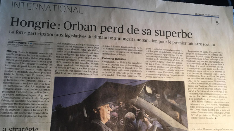 La malheureuse correspondante, dans la première édition papier du Figaro, laissait prévoir (avec espoir) la défaite d’Orbán avec le titre : Hongrie, Orbán perd de sa superbe (titre calqué mot pour mot sur un article de L’Humanité ?). Mieux « un fort taux de participation menaçait de transformer en revers, voire même en défaite cinglante… son parti le Fidesz ». Le reste – pour la décidemment malchanceuse journaliste (stagiaire peut-être ?) — est de la même eau. Nous citons : autoritarisme croissant, scandales de corruption, campagne très manichéenne, exaspération croissante de la population qui n’aime pas les mensonges. Bien entendu une forte participation pouvait permettre d’augurer d’une victoire de l’opposition « si la participation devait atteindre 70% un éventuel basculement pourrait même se produire, ce qui serait un tremblement de terre politique » Fin de citation.