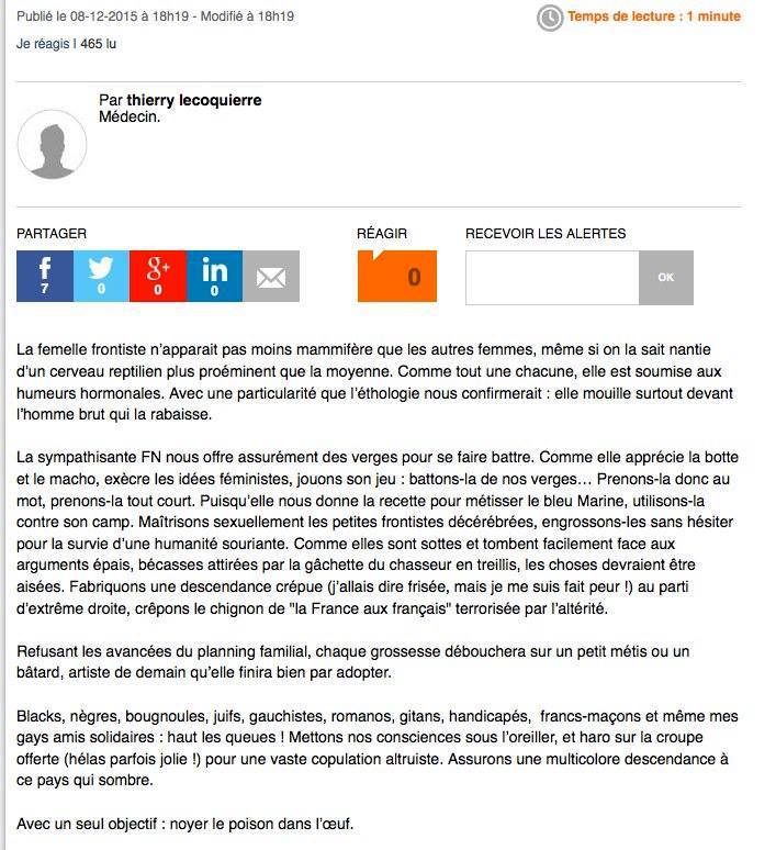 Signé par un certain Thierry Lecocquierre, médecin de son état, et publié sur le site de L’Obs, le texte commençait par affirmer que « la femelle frontiste n’apparait pas moins mammifère que les autres femmes, même si on la sait nantie d’un cerveau reptilien plus proéminent que la moyenne ».
