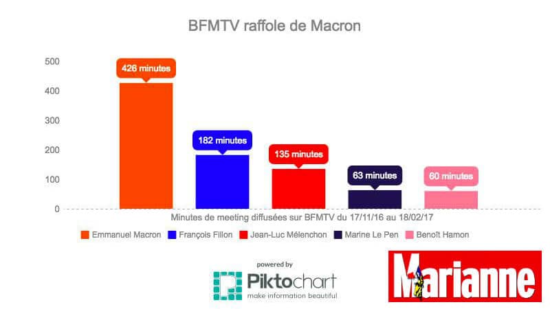 Ainsi, Emmanuel Macron a cumulé 440 minutes de meeting sur la première chaîne info de France, contre 426 minutes pour ses quatre principaux concurrents réunis : 182 minutes pour François Fillon, 135 minutes pour Jean-Luc Mélenchon, 63 minutes pour Marine Le Pen et 60 minutes pour Benoît Hamon.