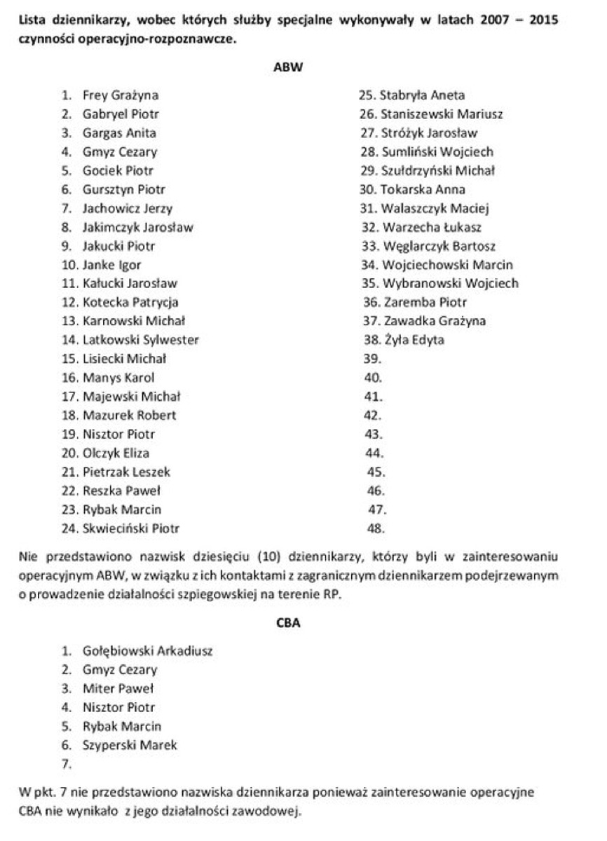 Certains des rapports présentés ont abordé la question de la surveillance illégale de leaders politiques et de journalistes d’opposition par les services spéciaux dans les années 2007–2015. La chancellerie du premier ministre a ainsi publié une liste de 42 journalistes surveillés par le contre-renseignement (ABW) et le bureau de lutte anti-corruption (CBA). Une liste que voici :