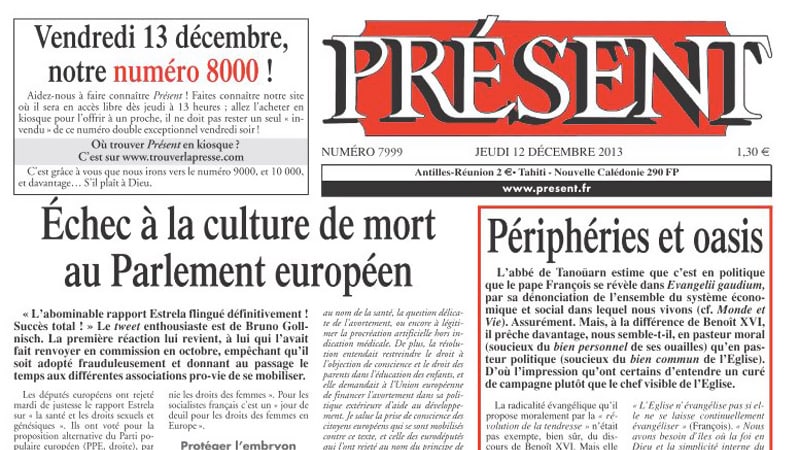 Présent n’a pas été invité à participer à la semaine de promotion des quotidiens qui s’est déroulée du 6 au 13 octobre. En cause, du moins officiellement : une diffusion jugée trop faible du journal catholique chez les marchands de journaux (environ 500 exemplaires). L’Humanité, et même le quotidien hippique Gény courses, ont en revanche eu droit de bénéficier gracieusement des supports publicitaires réservés à cette occasion.