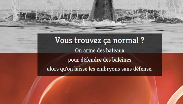 Sur cette publicité, on peut voir une baleine et un embryon humain, avec le commentaire suivant : « Vous trouvez ça normal ? On arme des bateaux pour défendre des baleines alors qu’on laisse les embryons sans défense ».