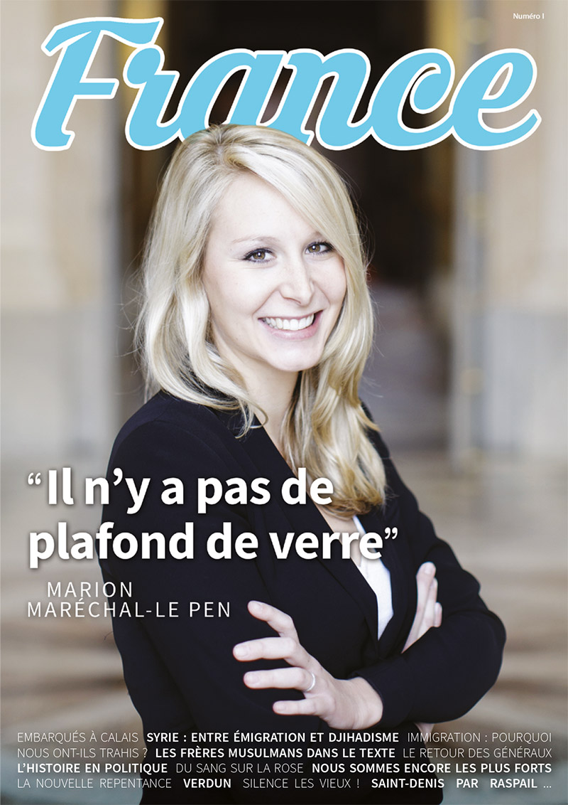 L’orientation politique est clairement exprimée aussi bien dans l’éditorial que dans le choix des entretiens : proche du Front National de Marion Maréchal Le Pen sans se confondre avec le parti et en élargissant son lectorat potentiel. Avec onze pages d’entretien – et plus de dix photos dont la couverture, la députée FN du midi tient la vedette. L’avenir dira si France saura s’imposer dans la durée en construisant un modèle économique qui ne s’impose pas de lui-même (lire en ligne, ou bien télécharger le PDF).