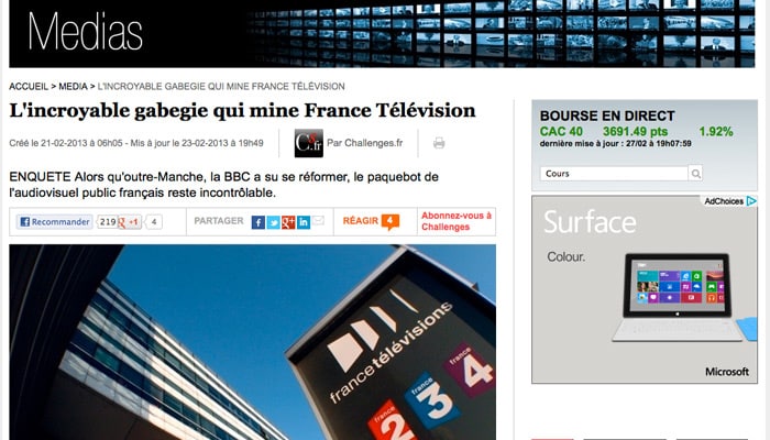 L’hebdomadaire Challenges présente cette semaine un très intéressant comparatif entre la gestion de la BBC et celle de France Télévisions. Une chose est sûre : la comparaison n’est pas à l’avantage du groupe public français !