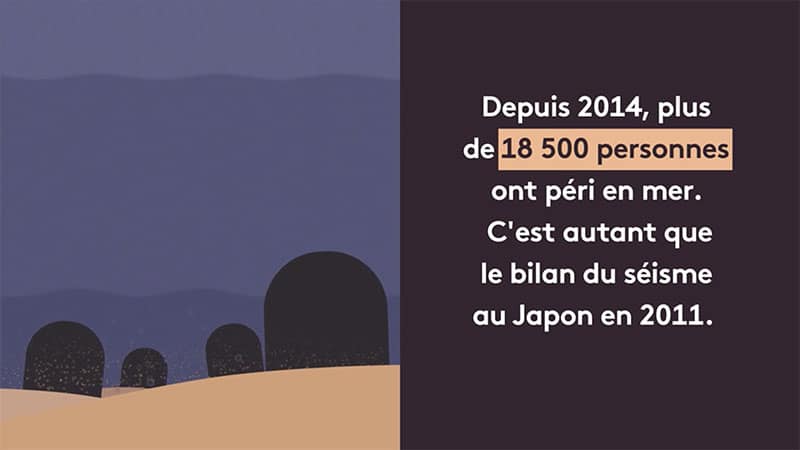La vidéo est accompagnée d’un texte complémentaire et est présentée ainsi. Titre : « Traversées, noyades, sauvetages… Huit chiffres pour comprendre la tragédie des migrants en Méditerranée ». Chapeau : « Renvoyés en Libye, où les droits de l’homme sont quotidiennement bafoués à l’égard des migrants, ceux qui survivent à la traversée sont invités à errer aux portes d’une Europe de plus en plus hermétique ». La vidéo dure deux grosses minutes, est composée d’images d’animation uniquement, destinées à frapper les esprits. Le texte apparaît en sur-ajout de ces images.