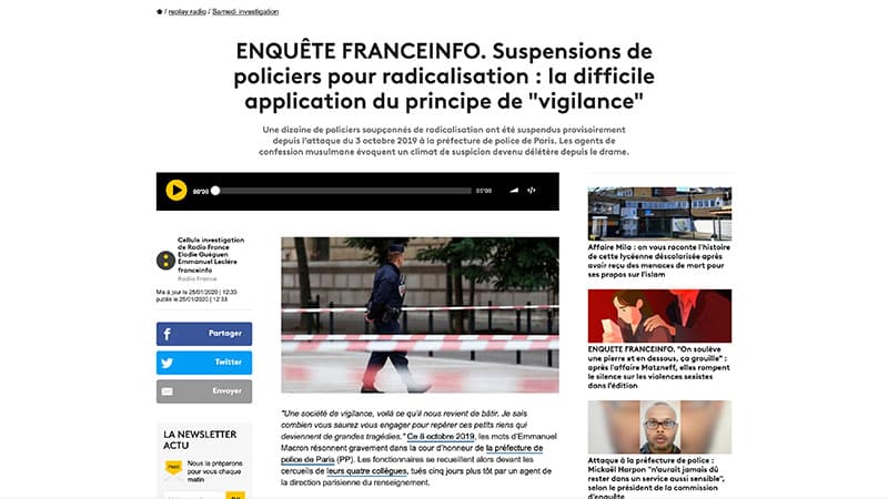 Le 25 janvier 2020 au matin, le reportage de la Cellule investigation de Radio France, réalisé par Elodie Guéguen et Emmanuel Leclère, diffusé à plusieurs reprises sur Franceinfo durant 5 minutes, interroge l’observateur sur la façon qu’ont une partie des médias de percevoir la « radicalisation » dans la police, puisque c’est l’étrange mot maintenant retenu, mot qui masque souvent le fait que les radicaux en question sont des musulmans.