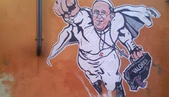 Dernière preuve en date, et de taille : mardi 28 janvier, le compte Twitter du pape (très suivi) a publié une photo prise à Rome montrant une peinture murale du pape… en Superman ! L’inscription « Valores » (valeurs) barrant sa mallette, le pape François s’envole tel un super-héros dans une époque qui en a de moins en moins…