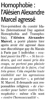 Alors que, selon Alexan­dre Mar­cel, le vice-prési­dent du comité Ida­ho (Inter­na­tion­al Day against Homo­pho­bia and Trans­pho­bia), « cinq Maghrébins se sont présen­tés vers 2 heures (du matin, ce same­di, ndlr) devant la dis­cothèque le CUD, dans le IIIe arrondisse­ment pour ‘punir les PD au nom du Coran’ », qu’« il y a eu des échanges de coups de poings », qu’« un d’entre eux a réus­si à ren­tr­er dans l’établissement et a arrosé la foule, dont moi-même à l’aide d’une bombe lacry­mogène au poivre », cer­tains médias ont une manière bien à eux de relay­er l’af­faire, comme Le Midi Libre ce dimanche :