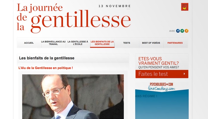 À l’occasion de la journée de la gentillesse, Psychologies magazine a demandé à vingt-sept journalistes, parmi les plus connus, de désigner l’élu de la gentillesse en politique ! Parmi les votants, on trouve Christophe Barbier, Ruth Elkrief, Renaud Dely, Catherine Nay, Alain Duhamel, Laurence Ferrari, ou encore Laurent Delahousse. L’heureux gagnant de ce concours n’est autre que le président de la République, François Hollande, qui obtient 19 voix.