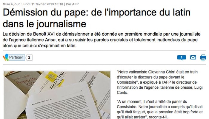 C’est une journaliste de l’agence de presse italienne Ansa, maîtrisant le latin, qui a, la première, relayé l’information du renoncement du pape à ses fonctions, lundi 11 février. Le directeur de l’agence, répondant à l’AFP, a du coup insisté sur la nécessité d’apprendre cette langue morte pour les journalistes.