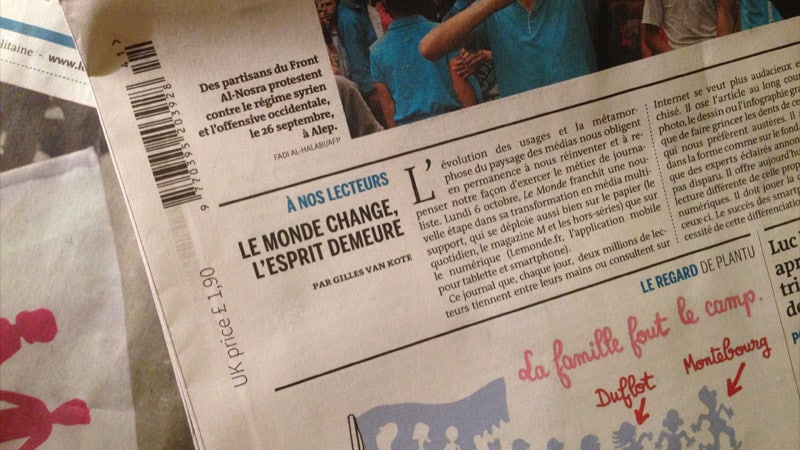 Ces fortes paroles de Gilles Van Kote, directeur intérimaire du Monde, dans l’édition datée du mardi 7 octobre 2014 (disponible à Paris le lundi 6) marqueraient le début d’une nouvelle ère, donnant « les clés d’une meilleure compréhension de l’actualité ». Las, la lecture du premier numéro de la nouvelle formule n’incite pas à l’optimisme. Autrement dit, comme on pourra le constater, oui « l’esprit demeure ».