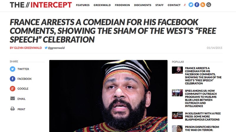 Même le journaliste Glenn Greenwald, connu pour avoir publié les révélations d’Edward Snowden, a apporté son grain de sel. Sur son compte Twitter, celui-ci a publié une image montrant le texte « #JeSuisDieudonne » avant d’appeler « tous les défenseurs de la liberté d’expression des pays Occidentaux » à poster ceci « en signe de solidarité ».