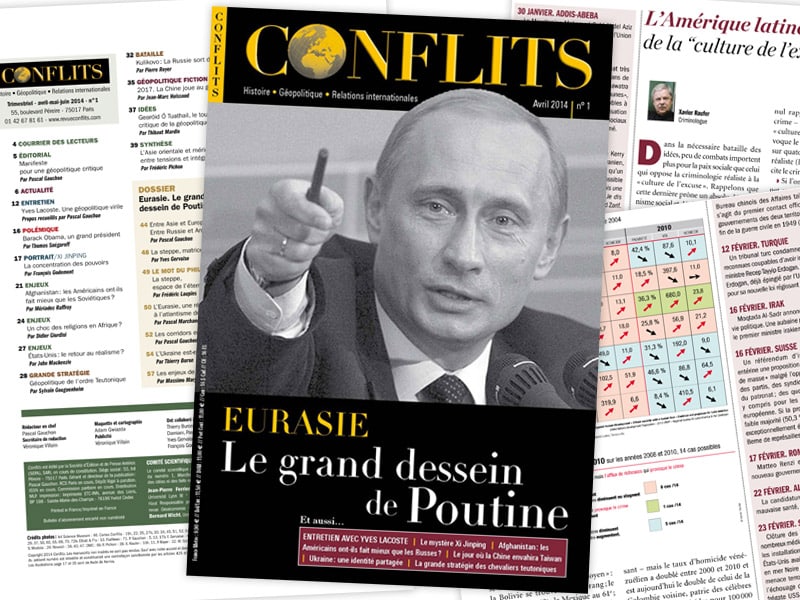 Annoncée depuis plusieurs mois et très attendue, la revue trimestrielle de géopolitique Conflits livre son premier numéro daté d’avril-mai-juin 2014. Conçu avant l’annexion de la Crimée par la Russie, le sommaire de ce numéro un est consacré à l’Eurasisme (« Eurasisme, le grand dessein de Poutine »). La revue arrive ainsi à point nommé pour éclairer l’actualité internationale en fournissant des analyses approfondies que les médias traditionnels, dans leur grande majorité, ont malheureusement renoncé à produire, au profit de réactions sentimentales et manichéennes.