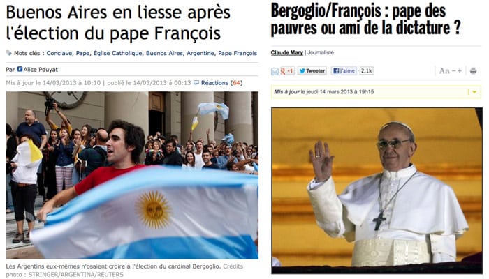De son côté, Rue89 préfère insister sur le passé du nouveau pape et son rôle sous la dictature, et décrire des rues quasiment vides : « À Buenos Aires, ni mouvement de foule, ni manifestation de liesse après l’élection du cardinal Bergoglio, premier pape latino-américain, premier jésuite… Tout juste une messe dans la cathédrale métropolitaine, à deux pas de la Casa Rosada, le palais du gouvernement, dans un pays où les trois quarts des habitants se considèrent catholiques, et seulement 23% pratiquants. »