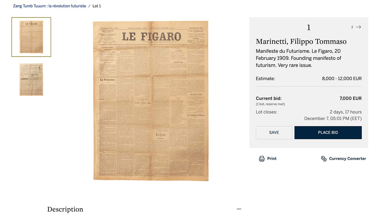 “La révolution futuriste” fait l’objet d’une vente aux enchères au sein de la réputée maison Sotheby’s. Parmi les objets de curiosité proposés figure le célèbre manifeste du futurisme de Marinetti paru en 1909 dans Le Figaro.