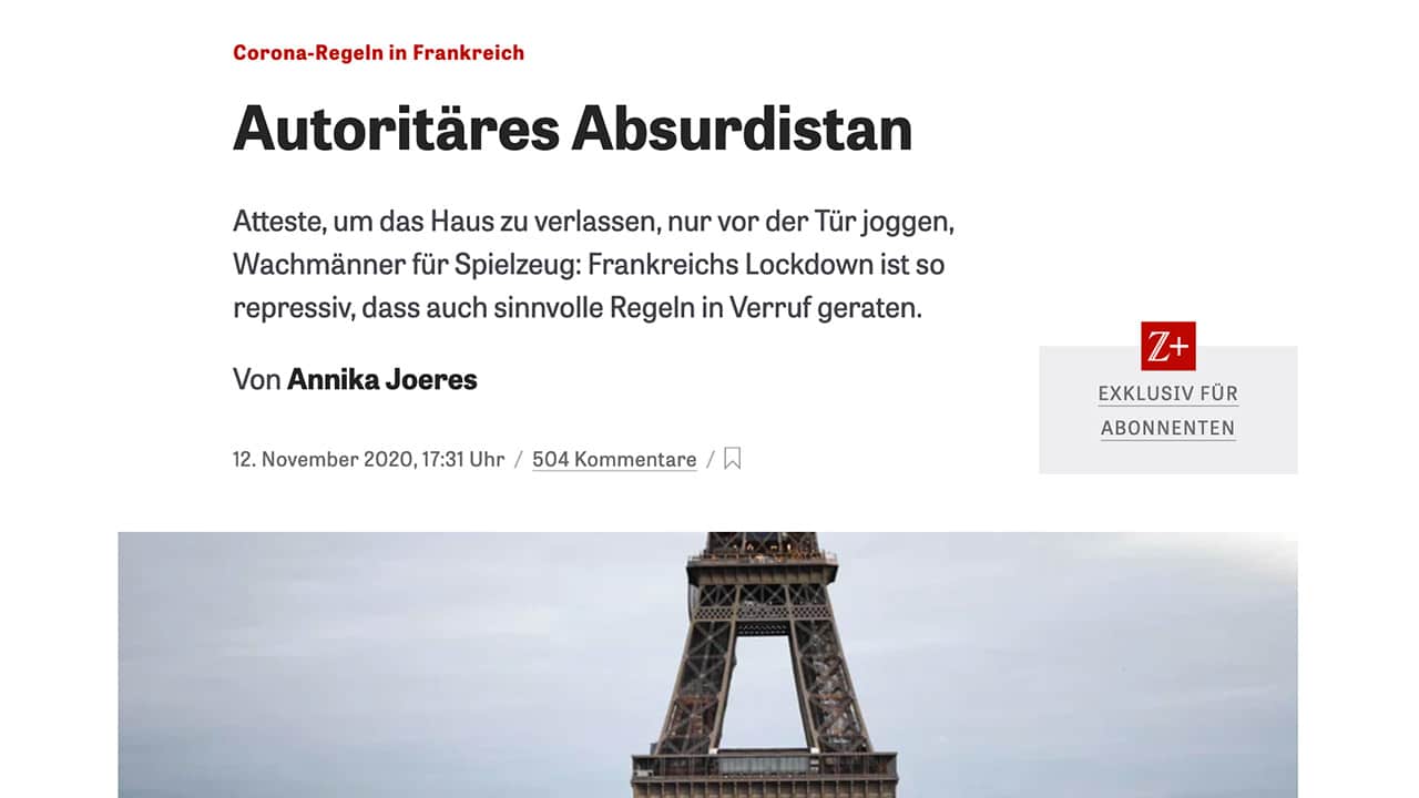 Le 12 novembre 2020, le journal allemand Die Zeit publiait un article sur l’« Absurdistan autoritaire » imposé par le gouvernement français à ses concitoyens. Les règles du confinement dans notre pays y sont décrites sans concession. Mais le sujet est loin d’avoir été épuisé, comme en témoignent de nombreux articles et émissions à ce sujet. Revue de presse des délires technocratiques.