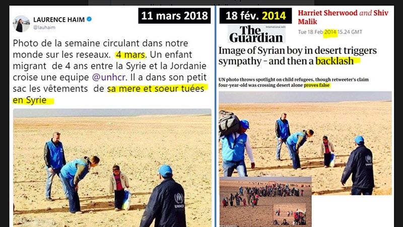 Quatre ans après, le 11 mars 2018, Laurence Haïm tweete sur la même photo : « Un enfant de 4 ans entre la Syrie et la Jordanie croise une équipe @unhcr. Il a dans son petit sac les vêtements de sa mère et de sa sœur tuées en Syrie ». Une nouvelle affaire de faux après celle d’Aylan en septembre 2015 et l’affaire Omrane mise en scène en août 2016 par l’AFP. On n’arrête pas le progrès…