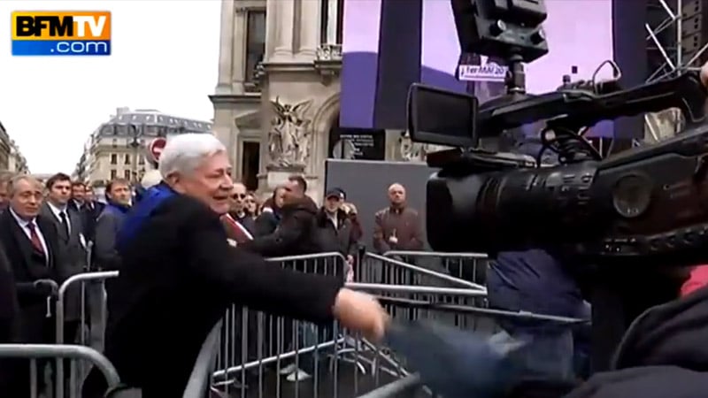 « Les provocateurs de Canal + pratiquent le micro-perche espion. Après 30 mn., j’ai détruit l’espion. Petite leçon gratuite de déontologie… », a posté Bruno Gollnish sur Twitter. En effet, sur des images filmées par BFMTV, on peut voir le député européen agacé saisir la perche d’un journaliste du « Petit Journal » et l’écarter à coup de parapluie.
