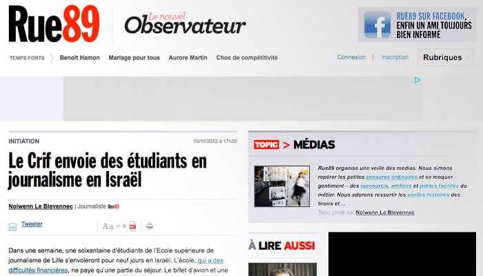 L’affaire est révélée par Rue89 : dans une semaine, une soix­an­taine de jour­nal­istes de l’ESJ de Lille s’envoleront pour neuf jours en Israël, une par­tie de leurs frais étant prise en charge par leur école et une autre par le CRIF.