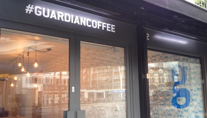 Le café a déjà son twitter #guardiancoffee. Ouvert aux journalistes ou apprentis journalistes (et au public ?) le café est riche en gadgets électroniques. Écrans plats sur les murs transmettant les tweets en temps réel, une tablette encastrée dans chaque table. Si les boissons sont au prix du quartier (l’équivalent de 2,50 livres le café expresso), l’atmosphère est décrite par le magazine Vice comme « stérile, mortelle… sans vie et cynique ».