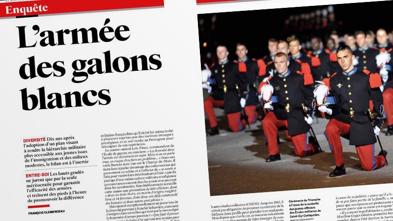 Tout est dans le balancement. Le titre général L’armée des galons blancs donne le ton. Ignorant manifestement l’histoire de l’infanterie de marine (ex-infanterie coloniale) comme celle de la Légion – deux exemples où la mixité raciale et religieuse était une donnée constitutive – l’auteur met sous le titre général deux sous-titres en rouge et qui font balancier : Diversité et Entre-soi. Entre-soi ce n’est pas bien sympathique et d’ailleurs « les hauts gradés…traînent des pieds à l’heure de promouvoir la différence ». Diversité vous a un petit air chic et printanier, mais hélas « le bilan est à l’inertie ».