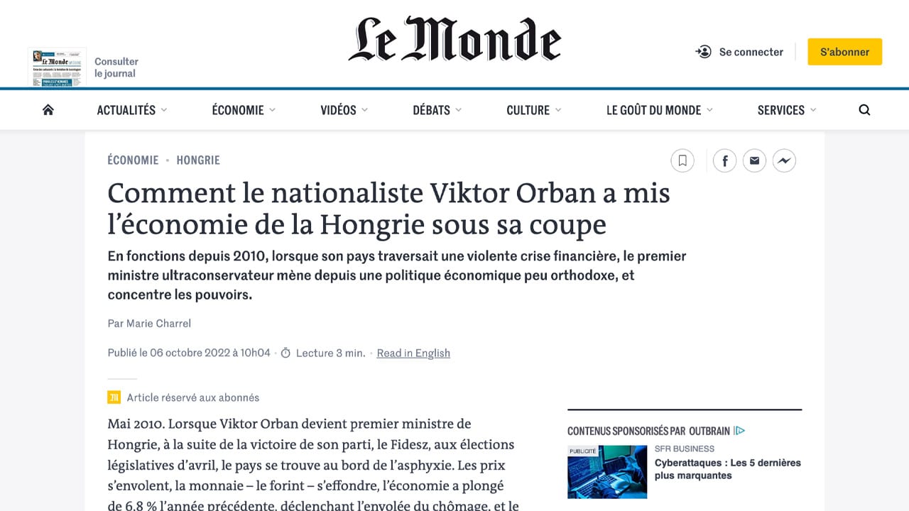 Notre grand quotidien du soir n’en est pas à sa première saillie contre le dirigeant magyar. Le Monde a habitué ses lecteurs à des laïus poussifs dépeignant un Viktor Orbán corrompu, autoritaire, xénophobe et poutinophile. Il est en revanche moins courant que le quotidien s’attaque à la Hongrie sur le terrain économique. C’est à cet exercice que s’est livrée Marie Charrel dans un article intitulé « Comment le nationaliste Viktor Orbán a mis l’économie de la Hongrie sous sa coupe » paru le 6 octobre.
