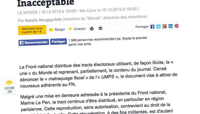 Nathalie Nougayrède ne mâche pas ses mots. Elle n’a pas supporté que le Front National illustre un tract avec la une du Monde du 4 septembre dernier : « Sarkozy — Hollande 84 nouveaux impôts en deux ans » !