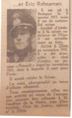 Voici le texte de l’article : « Eric Rebsamen est né à Stuttgart le 9 janvier 1917 mais il est de nationalité suisse. Inculpé d’atteinte à la sécurité extérieure de l’État, il est actuellement en fuite. Arrivé à Dijon en novembre 1939, il a été interprète et chef d’atelier au garage Renault jusqu’en novembre 1943, date à laquelle il part pour Paris. Il aurait rejoint la Suisse. Le voici photographié en tenue d’officier allemand. Tous renseignements utiles sur son activité au cours de l’occupation peuvent être adressés à M. Geoffroy de la Mothe, juge d’instruction. Cour de Justice, cabinet n°5, Dijon »