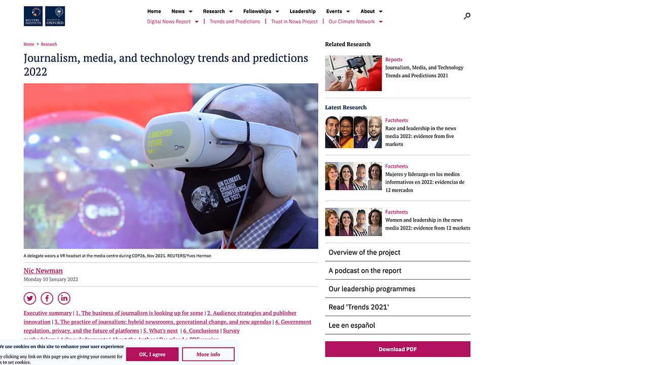 L’institut Reuters de journalisme à l’Université d’Oxford a, en janvier 2022, publié son rapport annuel concernant les évolutions dans le domaine journalistique. Document incontournable pour quiconque souhaite connaître les évolutions dans la manière de produire et de concevoir les produits journalistiques, il se penche cette année sur l’après-COVID dans les médias. En une phrase, ce rapport mise, pour l’année 2022, sur le fait de renforcer les acquis plutôt que d’en créer. Au-delà de ces considérations commerciales, le rapport n’est pas exempt de certaines considérations « déontologiques » et idéologiques bien connues.
