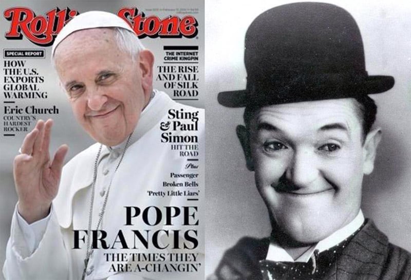 Si vous avez éprou­vé, vous aus­si, cette sym­pa­thie incom­préhen­si­ble pour son sourire et son men­ton en galoche, sachez qu’elle n’est pas si incom­préhen­si­ble que cela. Ne cherchez plus, tapez Stan Lau­rel Pope Fran­cis sur Google et vous ver­rez que la presse anglo-sax­onne est remon­tée depuis longtemps jusqu’aux raisons pour lesquelles ce vis­age « nous dit quelque chose ». Il en rap­pelle un autre dont le cap­i­tal sym­pa­thie était très élevé sur tous les con­ti­nents pen­dant tout le XXème siè­cle : Stan Lau­rel ! Un Tweet résume la chose ici :
