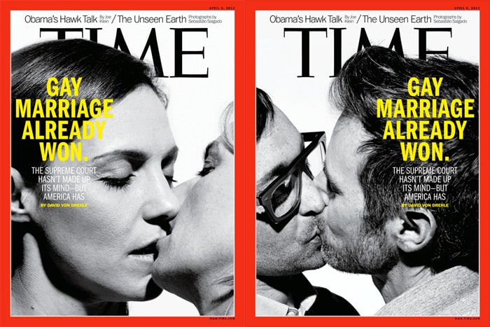 Le magazine le plus vendu aux États-Unis vient d’entrer dans le débat, qui a lieu également outre-Atlantique, sur le « mariage pour tous » avec une Une paritaire. Sur une photo, un couple d’hommes s’embrasse, sur l’autre, un couple de femmes ; toutes deux portant ce même titre : « Le mariage gay a déjà gagné. »