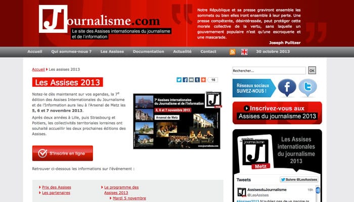 Après Strasbourg et Poitiers, la 7ème édition des Assises Internationales du Journalisme et de l’Information aura lieu cette année à l’Arsenal de Metz, les 5, 6 et 7 novembre 2013, avec la participation de l’Observatoire du Webjournalisme.