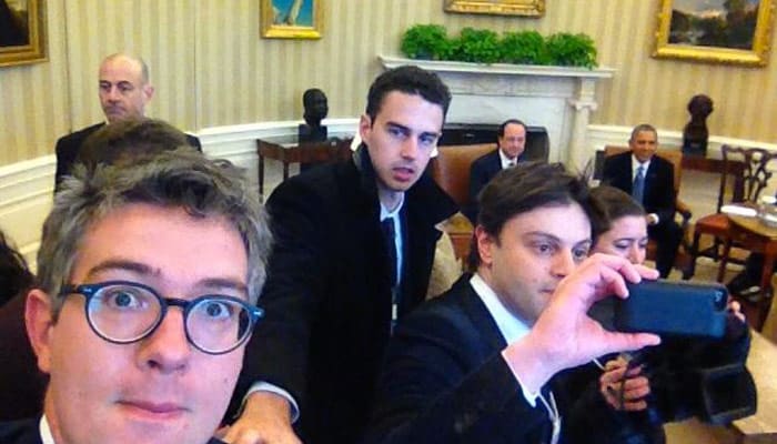 Thomas Wieder, journaliste politique au journal Le Monde chargé de l’Élysée et du gouvernement, s’est illustré sur Twitter en postant, outre le « seflie » dans le bureau ovale, une photo de lui au pupitre de Barack Obama avec ce commentaire sérieux : « Bon les gars je change de job… Porte-parole de la Maison-Blanche, ça ne se refuse pas. »