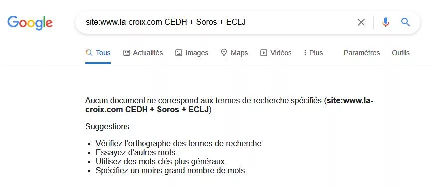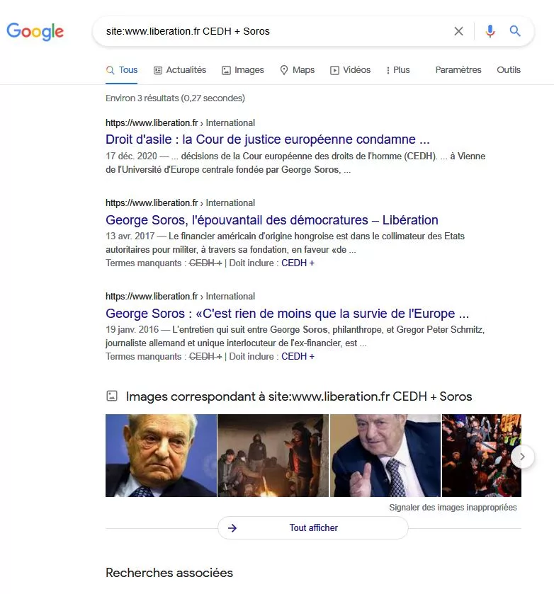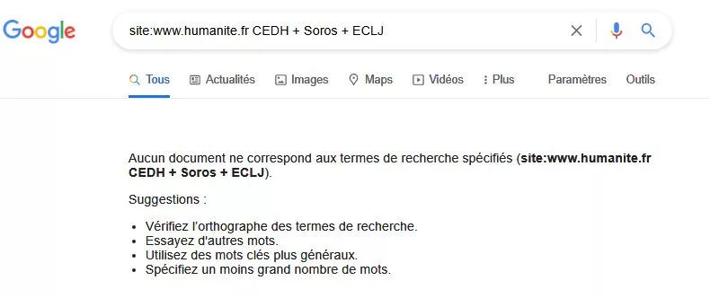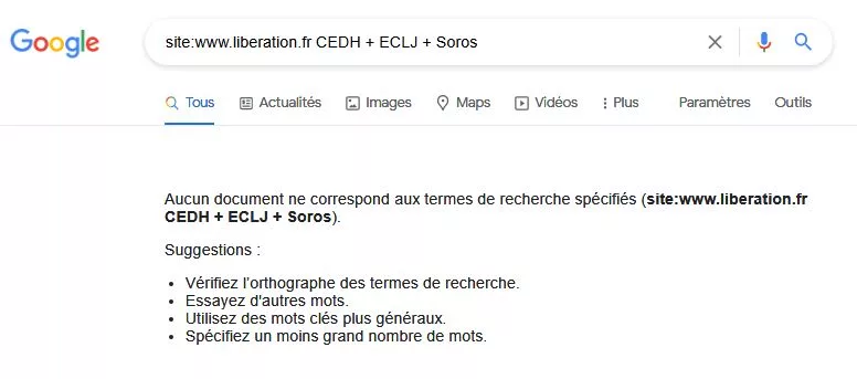 Le 8 avril dernier, le Comité des ministres des 47 pays membres du Conseil de l’Europe a apporté une réponse écrite à ces questions. À la mi-avril, l’ECLJ se réjouissait d’une autre conséquence positive de son rapport : le Conseil de l’Europe venait de rejeter une candidature belge de « juge Soros » pour la CEDH. Ceci pour dire que le rapport de l’ECLJ est pris au sérieux au Conseil de l’Europe et il a d’ailleurs fait parler de lui dans la majorité des pays européens. Et en France ? En France, les médias n’ont pas été très bavards à son sujet. Si l’on fait une recherche sur les sites des quotidiens nationaux, on s’aperçoit même que certains ont préféré passer la question totalement sous silence. C’est apparemment le cas de Libération et de L’Humanité comme le montrent ces recherches Google faites le 11 mai par l’Observatoire du Journalisme :