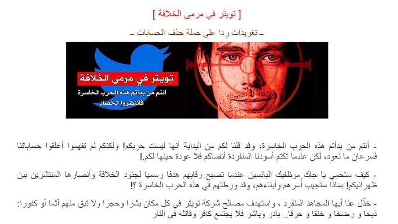 Islamic State has issued a death threat against Twitter co-founder @Jack Dorsey http://t.co/tcIvVhOR8s pic.twitter.com/kaNL7Q8T4g — UPI.com (@UPI) 2 Mars 2015
