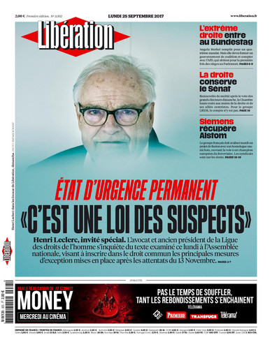 Outre le fait de s’inquiéter que des mesures légales de protection de la population entrent en vigueur en temps de guerre, dans un pays qui compte près de 250 morts du fait du terrorisme islamiste, ce qui peut sembler démagogue est double. Le grand titre, d’abord, destiné à effrayer quiconque s’arrête devant au petit matin : la « loi des suspects » de sinistre mémoire réfère bien entendu à la Terreur de 1793, du moins pour le lecteur féru d’histoire. Une minorité de la population. Pour bien d’autres lecteurs, nos sources sont formelles, ce sont des mots qui font penser à la période de Vichy. D’autant plus que la (méchante) droite « conserve le Sénat » tandis que « l’extrême droite entre au Bundestag ». C’est le second point : l’association entre « état d’urgence », « extrême droite », Allemagne, « droite », « état d’urgence permanent », sur fond d’inquiétude de l’ancien président de la Ligue des droits de l’homme, ne peut que faire association d’idées : la bête immonde est de retour et la « loi des suspects », loi antiterroriste, semble en être un marqueur.