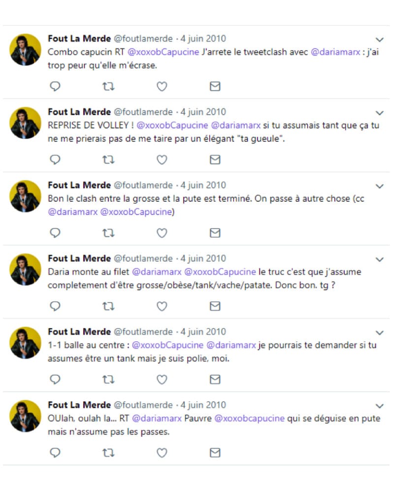 Un article de Numerama citait un tweet de @foutlamerde pour montrer que le compte “insultait directement les personnes”. Il s’agissait en fait d’une série de plusieurs tweets recensant un échange d’insultes entre Dariamarx et Capucine Piot, comme le montre la capture ci-dessous — à lire de bas en haut).